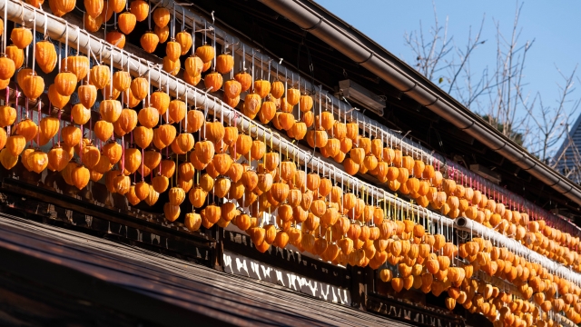 新しい家の軒先に柿が5個くらい吊るしてあるのを